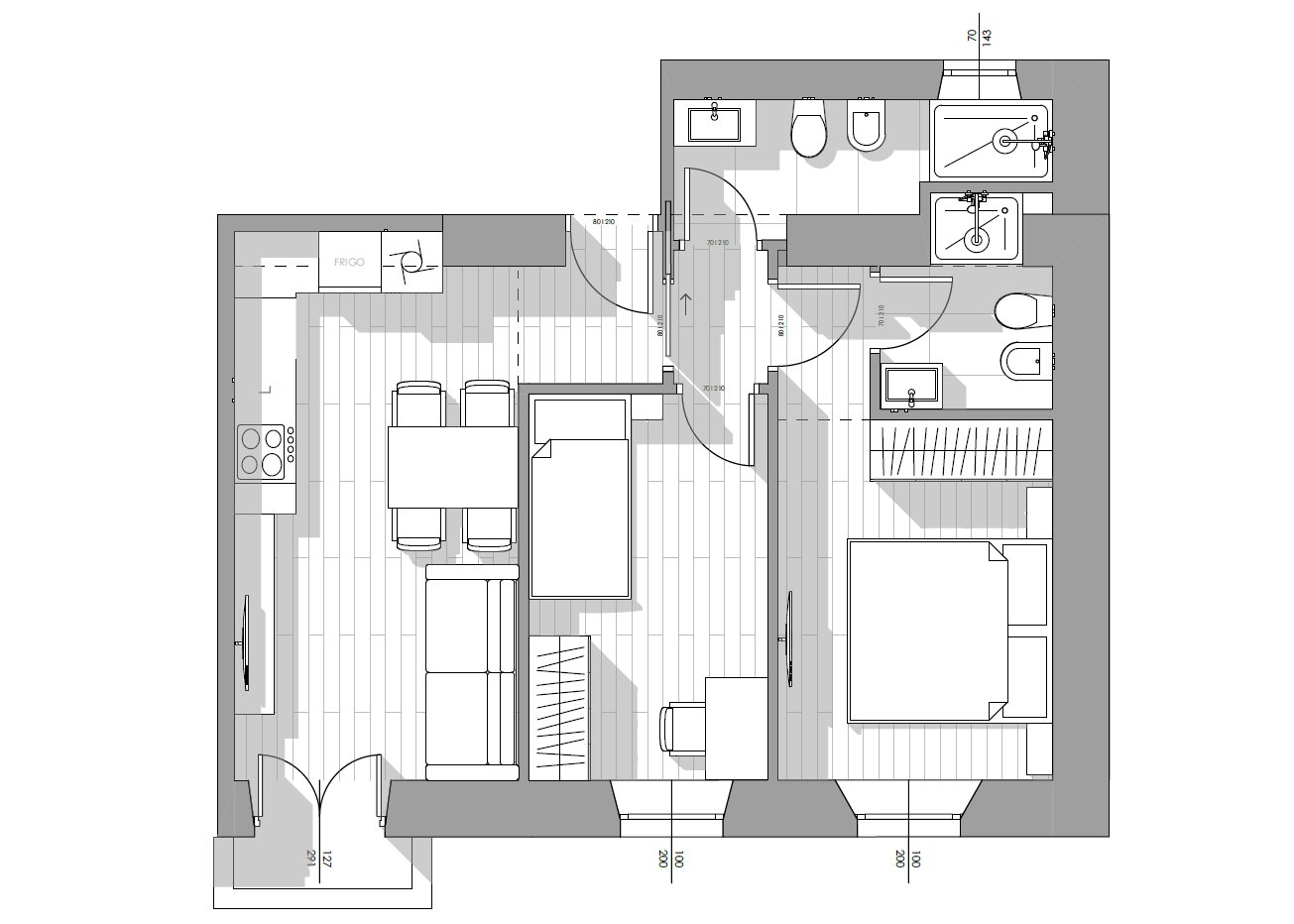 L'immobile è composto da ingresso, soggiorno con la cucina a vista e accesso al balcone, bagno con doccia finestrato, secondo bagno con doccia, camera da letto matrimoniale e camera singola